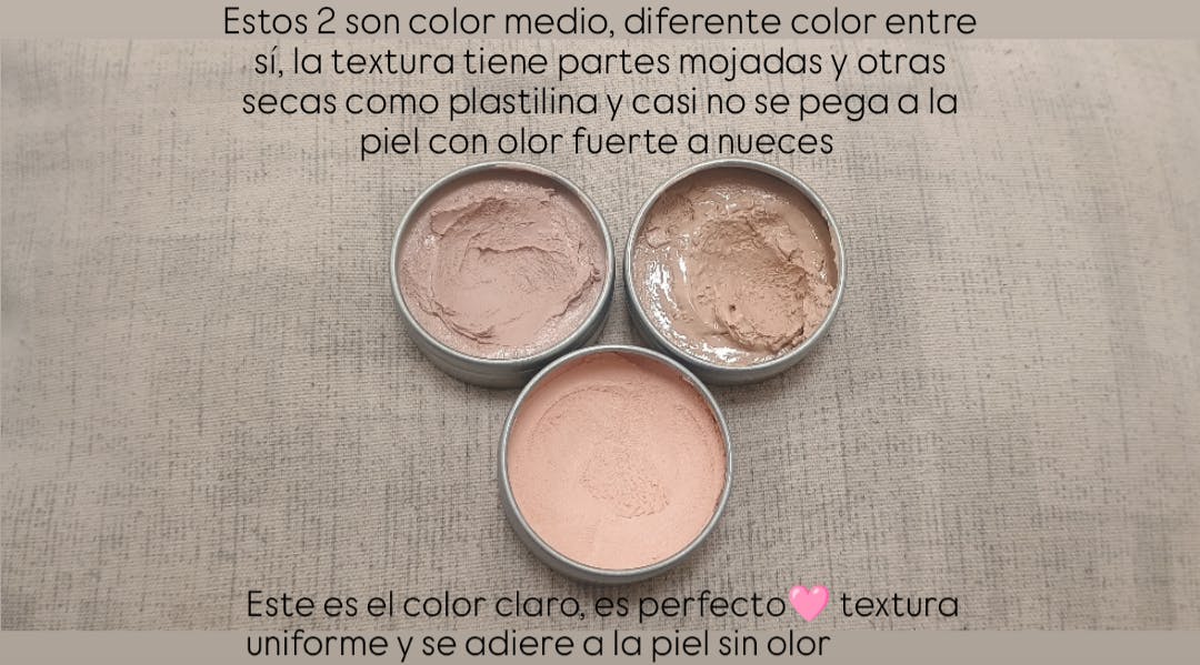 En tono claro es como mousse, se calienta en los dedos pero en el tono medio tuve problemas con él, tanto en textura, cobertura olor e irritación en la piel, tiene un olor fuerte a nueces pasadas y si tienes piel sensible, parches secos o acné los alborota, tal vez para una piel normal